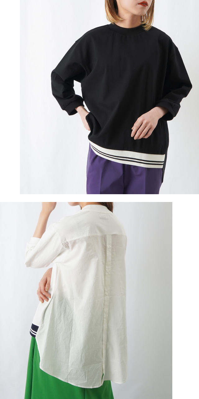 後ろはボタンを開けて雰囲気を変えられるシャツ素材の切替で、後ろ姿も周りと差がつくデザイン。